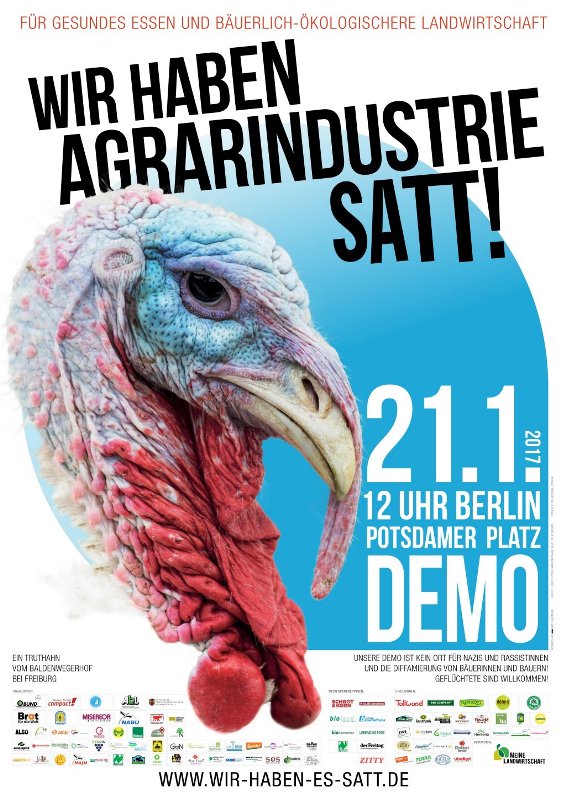 Man wolle die Agrarwende zum zentralen Thema im Wahlkampf machen, heißt es im Demonstrationsaufruf. 2017 sei ein Jahr der Entscheidungen: „Weiterhin Steuermilliarden für Agrar- und Chemieindustrie, Großgrundbesitz und Tierfabriken? Oder werden die regionale Landwirtschaft und das Lebensmittelhandwerk sowie Tier- und Umweltschutz gefördert?“, fragen die Veranstalter.