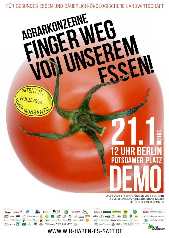„Wir haben es satt!“ – Demonstration richtet neun Forderungen an die nächste Bundesregierung. „Agrarkonzerne: Finger weg von unserem Essen!“ – unter diesem Motto werden zum Auftakt des Wahljahres am 21. Januar 2017 wieder Zehntausende in Berlin bei der siebten „Wir haben es satt!“– Demonstration für die Agrar- und Ernährungswende auf die Straße gehen.