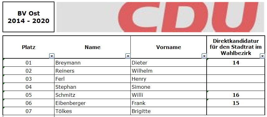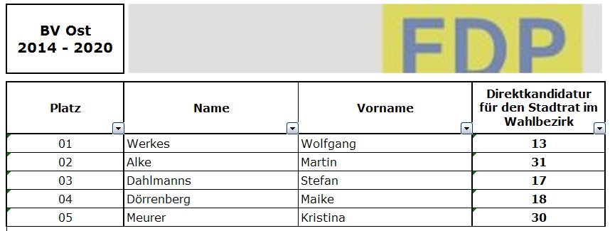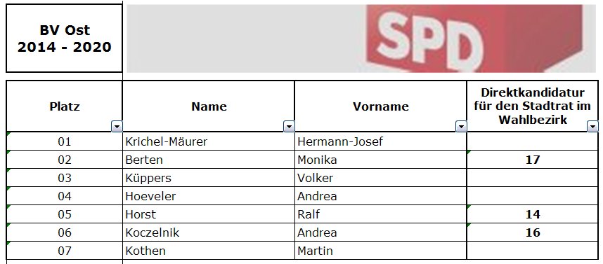 Die endgültige Zusammensetzung der BV Ost wird davon abhängen, ob die in den Rat gewählten Mitglieder von CDU und SPD neben diesem Mandat auch ihr Mandat in der Bezirksvertretung wahrnehmen wollen. Bei den übrigen Mitglieder der BV stellt sich diese Frage nicht.