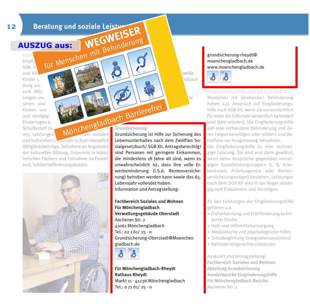 Orientiert sich ein ortsunkundiger Betroffener an den Angaben im aktuellen „Wegweiser für Menschen mit Behinderungen“ mit dem Untertitel „Mönchengladbach barrierefrei“, findet er sich an der postalischen Anschrift des Rathauses Rheydt „Markt 11“ (Eingang E, Haupteingang) wieder.