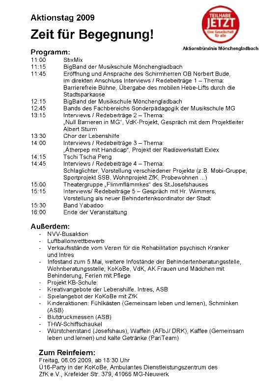 Seit 1997 beteiligt sich ein breites Aktionsbündnis aus Verbänden, Behinderteneinrichtungen und Selbsthilfe-Initiativen mit dem Mönchengladbacher Aktionstag an der bundesweiten Kampagne der Aktion Mensch rund um den Europäischen Protesttag zur Gleichstellung von Menschen mit Behinderung.