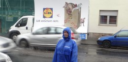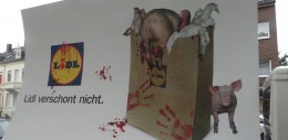 Mit einem Plakatwagen machten die Aktivisten des Tierschutzbüros vor dem Discounter mit ihrer Kampagne über Massentierhaltung „Lidl verschont nicht“ auf das Leid der Zuchttiere aufmerksam.