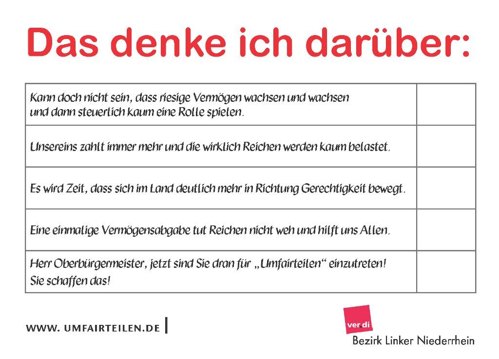 Auch die Postkarte an den Oberbürgermeister Bude, wurde gerne angenommen und direkt vor Ort ausgefüllt. Dazu gab es angeregte Diskussionen und überwiegende Einigkeit: Ja, der Oberbürgermeister soll sich für die Vermögenssteuer einsetzen und unsoziale Kürzungen in unserer Stadt unterlassen!