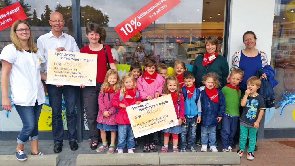 Insgesamt hat er in dieser Zeit 1.000 Euro eingenommen.“ Spontan stockte das dm-Team die Summe auf 3.000 Euro auf. Die Spende kommt zu gleichen Teilen der Katholischen Kindertagesstätte „Unserer lieben Frau“ und der Kindertagesstätte „Villa Kunterbunt“ zugute.